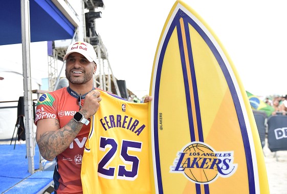 Parceria inédita tem por objetivo aumentar a visibilidade das maiores ligas esportivas do mundo em suas modalidades Na imagem: Italo Ferreira recebe itens personalizados do LA Lakers durante etapa da WSL no Brasil – Créditos: WSL/Staff Images ...
