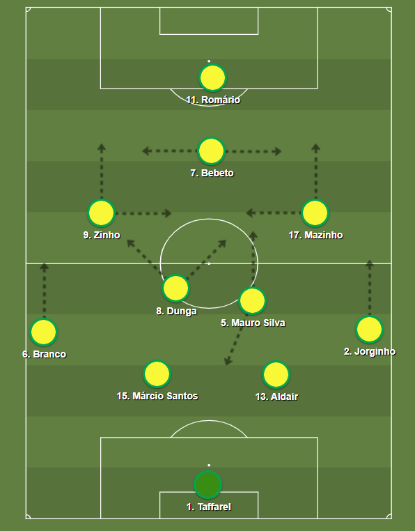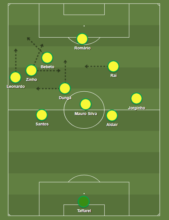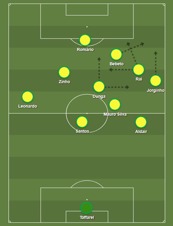 Sem a bola, defendíamos num 442 por zona, mas com encaixes por setor. O Brasil pressionava o adversário desde a saída com Dunga subindo para pressionar o portador. Com a bola, esse 442 virava um 4222, modelo dominante nos anos 90 no Brasil. Raí e Zinho viravam meias internos: